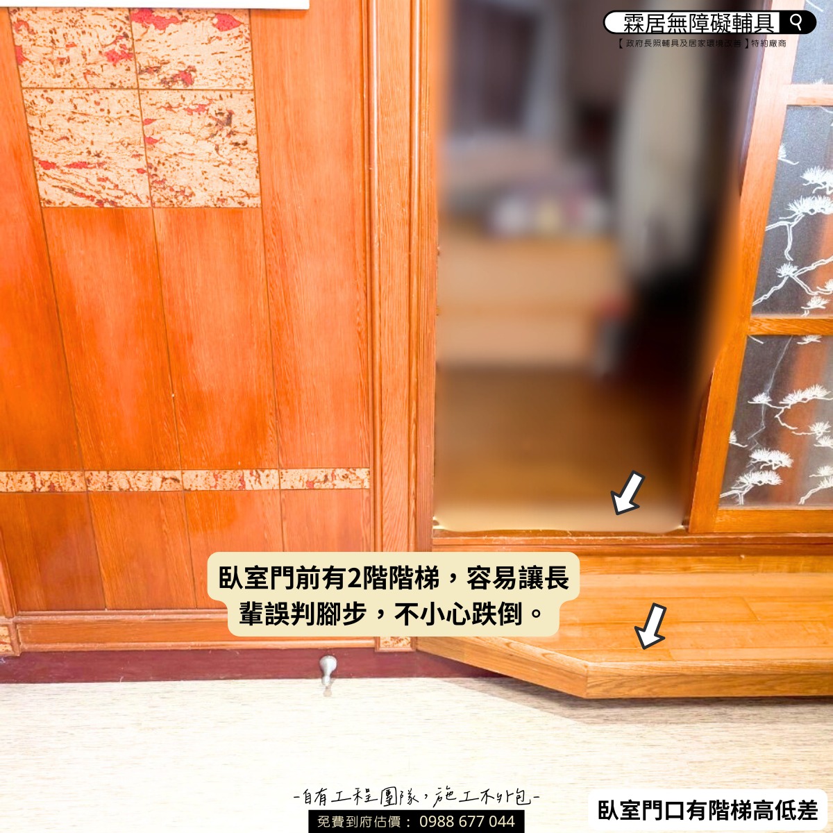就像照片中的架高木地板,外觀雖美,卻因高低差隱藏了跌倒風險。